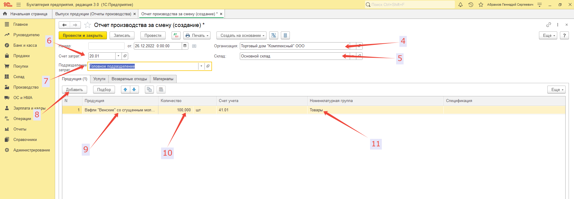 - выбрать продукцию (9), которая создавалась на протяжении смены;