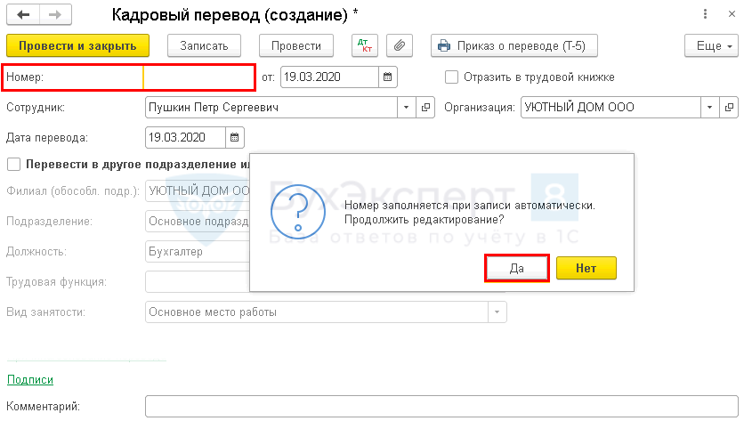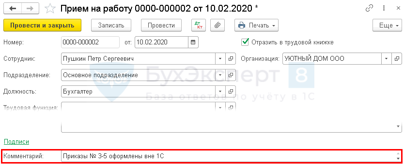 В этом случае нумерация кадровых переводов в 1С сдвинется на количество оформленных вне программы приказов. Чтобы не забыть восстановить нумерацию, в предыдущем приказе в 1С сделайте об этом пометку в поле Комментарий.