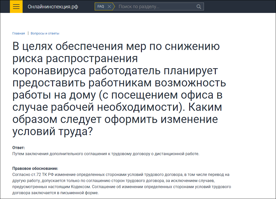 На варианте перевода на дистанционную работу по ст. 72 ТК РФ настаивают и специалисты Роструда на сайте Онлайнинспекция.рф.