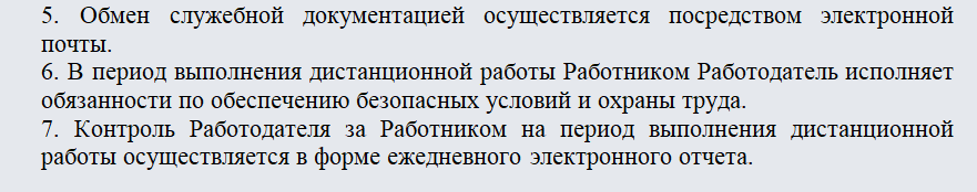 При необходимости в дополнительное соглашение о переводе на дистанционную работу могут быть внесены любые другие условия, изменяющие положения основного договора.