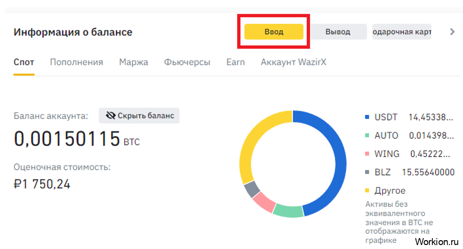 У каждого клиента биржи Binance есть мультивалютный баланс. Его можно пополнить фиатными деньгами или внести криптовалюту. Для этого в личном кабинете необходимо нажать кнопку «Ввод»: