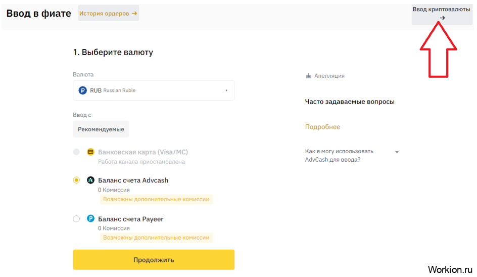 Дальше открывается страничка, где нужно выбрать валюту. В зависимости от этого, появляется список доступных способов. Рубли сейчас можно перевести через AdvCash или Payeer, пополнение с банковской карты временно недоступно: