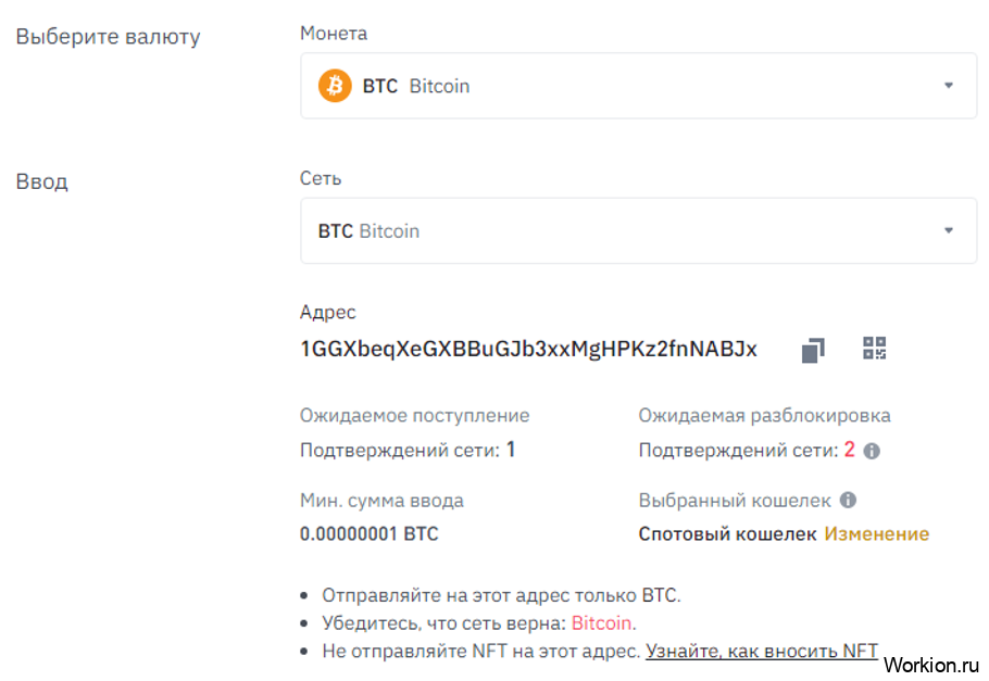 В верхнем правом углу есть кнопка для перехода к вводу криптовалюты. Также к нему можно перейти со странички, где представлены все балансы (нужно только нажать кнопку «Ввод» напротив нужной криптовалюты). При внесении монет открывается другая форма, в ней нужно выбрать монету и сеть, после чего появляется адрес кошелька, на который нужно сделать обычный перевод:
