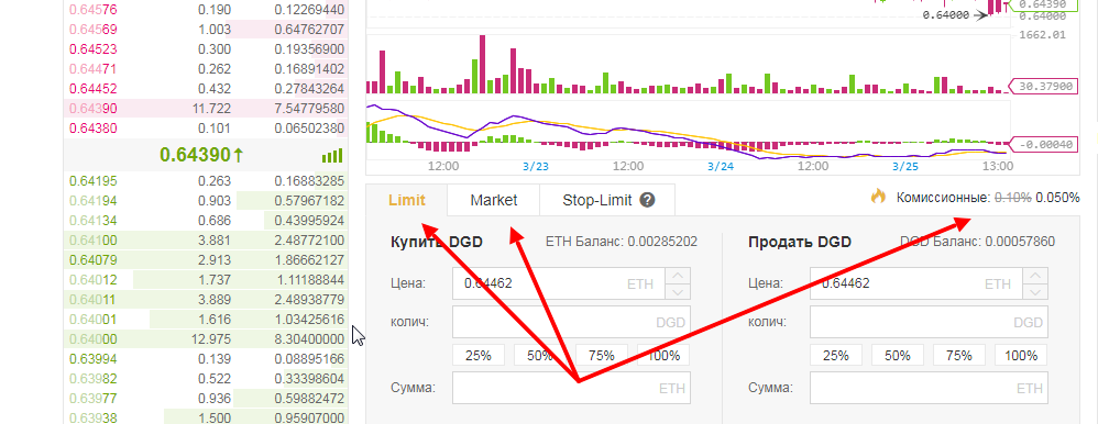 Для создателей лимитных ордеров комиссия ниже, чем для создателей рыночных. Это сделано, чтобы мотивировать участников рынка формировать больше предложений. Существуют усовершенствованные типы ордеров. Например, стоп-лимит создает дополнительное условие: триггер-цену, по достижении которой система создаст лимитный ордер с заданными условиями.