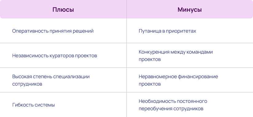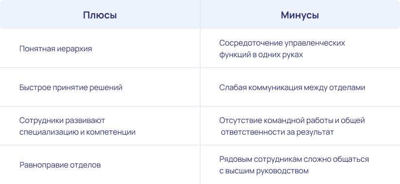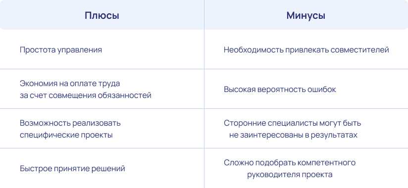 Это исключает необходимость дублировать указание, что положительно сказывается на эффективности и скорости работы. К недостаткам можно отнести возможность отсутствия взаимопонимания среди сотрудников. Поскольку ключевым звеном является специалист, то в случае расширения компании сложно осуществить контроль за каждым. Высок риск появления людей, работающих в свою пользу.