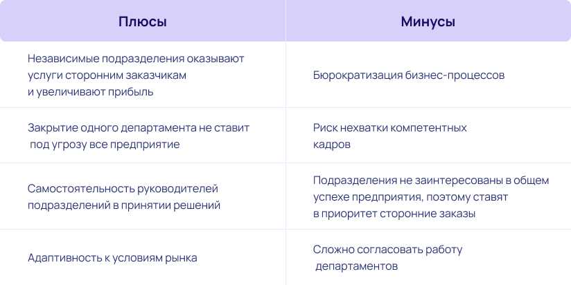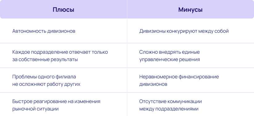 Плюсами данной структуры можно назвать быстрое принятие решений и отсутствие взаимосвязи между подразделениями, что исключает сбой работы всей системы в случае появления проблем в работе с определенным продуктом. К недостаткам относят сложность достижения единой цели для всех структурных подразделений, поскольку каждый будет заинтересован в развитии своего продукта.
