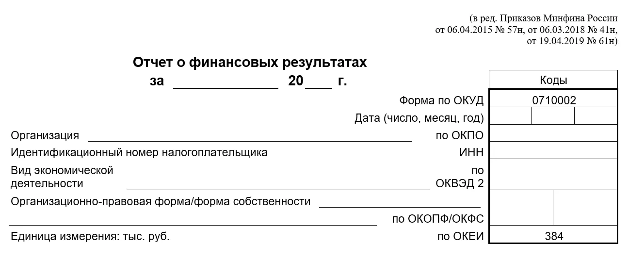 Долгое время, начиная с 1996 года, вторую форму бухгалтерской отчетности называли отчетом о прибылях и убытках. Но в 2011 году в закон о бухгалтерском учете Министерством финансов РФ были внесены изменения, согласно которым данный раздел теперь именуется отчетом о финансовых результатах. Однако вплоть до 2015 года документ носил прежнее название. Лишь после вступления в силу приказа Минфина № 57н он получил действующее в настоящий момент наименование.