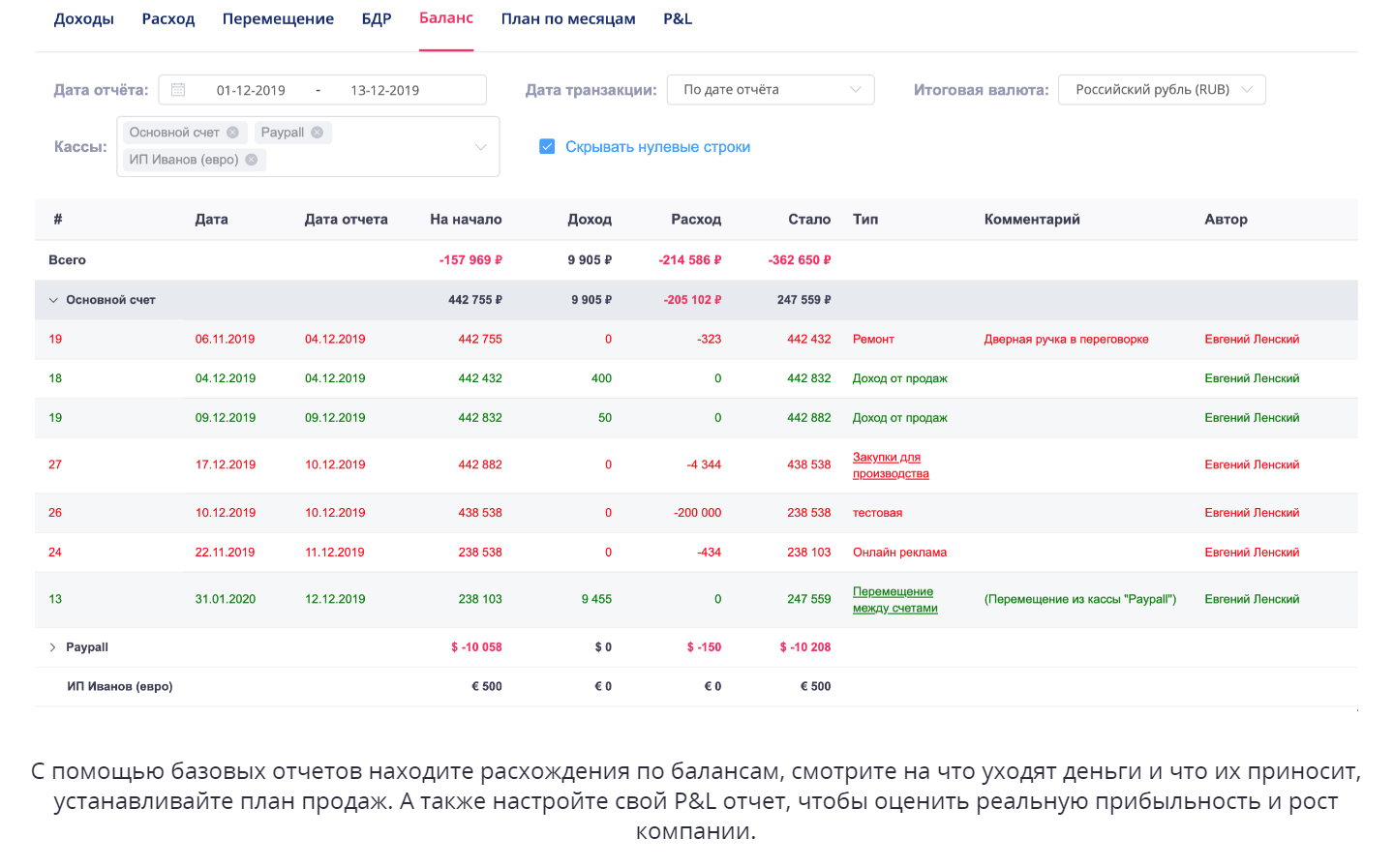 В Platrum удобно просматривать отчет по типам доходов и расходов, система помогает находить махинации и ошибки, а также учитывает мультивалютность, что крайне необходимо компаниям, выходящим на международный рынок.