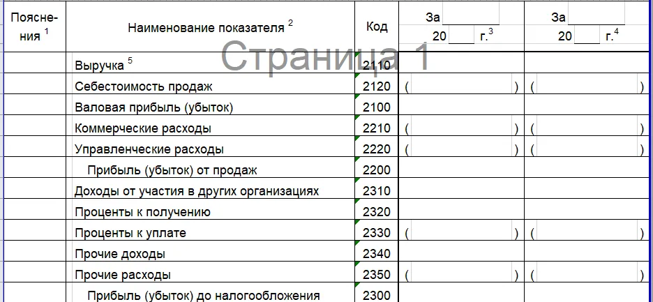 | Валовая прибыль (убыток) | 2100 | Разница строк: строка 2110 минус 2120. Если итог отрицательный, сумма берётся в круглые скобочки |