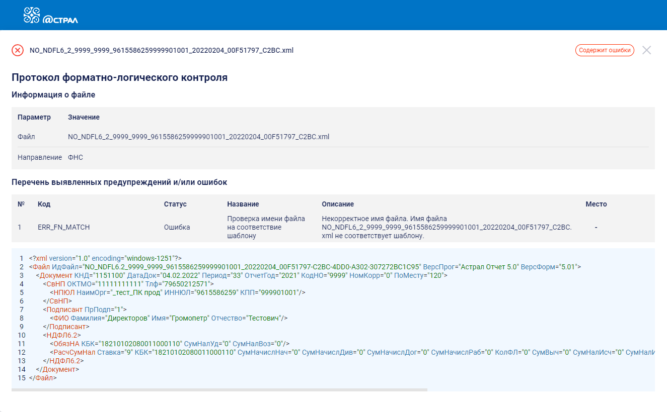 Посмотреть, какие ошибки обнаружил сервис, можно так же, как и в «1С: Отчётность» в протоколе форматно-логического контроля: