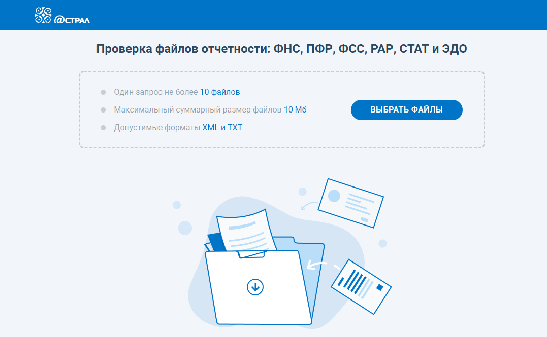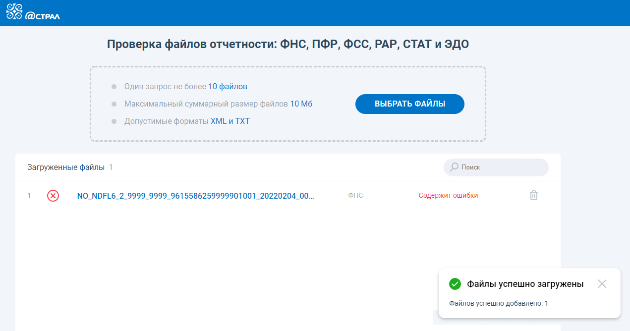 Для того чтобы проверить отчётность, нажмите на кнопку «Выбрать файлы». Загрузите один или несколько файлов отчётности в формате *.xml или *.txt. Файл отчётности будет автоматически проверен, после чего в сервисе отобразится результат проверки: