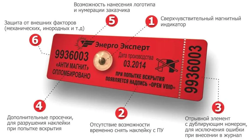 По этой причине контролирующие органы устанавливают антимагнитные пломбы на электросчетчики потребителей. Внешне они напоминают наклейку, однако ее устройство гораздо сложнее, чем может показаться на первый взгляд. Внутри пломбы содержится датчик, фиксирующий магнитные изменения. При пересечении определенного порога устройство срабатывает. В результате, когда подойдет срок поверки счетчика электроэнергии, сотрудник контролирующих органов сможет определить по внешнему виду устройства наличие постороннего вмешательства.