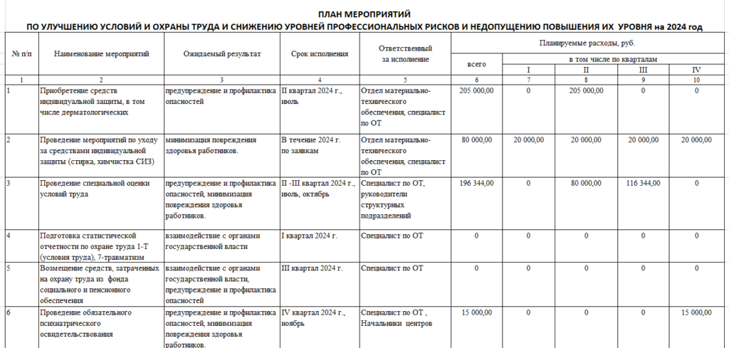 Давайте посмотрим, как будет выглядеть План мероприятий по улучшению условий труда на 2024 год.