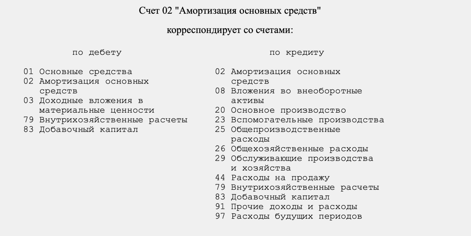- начислена амортизация – Дт 20, 23, 26, 44 и т. д. Кт 02.