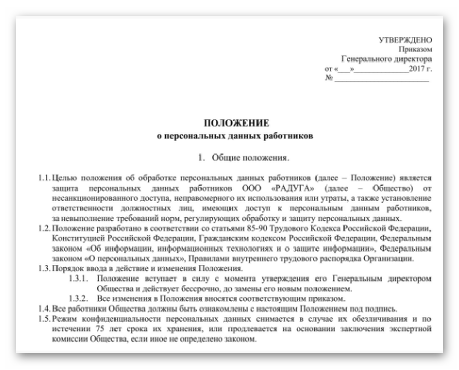 В данном разделе допустимо ссылаться на ФЗ «О персональных данных» №152, Трудовой кодекс и Конституцию РФ. Также стоит определить порядок обработки информации о сотрудникахорганизации.