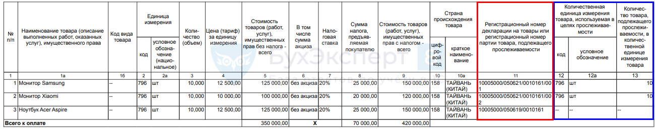 Поэтому часть реквизитов в СФ (КСФ, УПД) доступна только в электронном формате (ст. 2 Закона 371-ФЗ). В печатной форме они не выводятся. Если прослеживаемых товаров нет в счете-фактуре, то графы 12-13 не выводятся на печать. У тех, кто работает с ЭДО, они будут, но заполнять их не требуется.