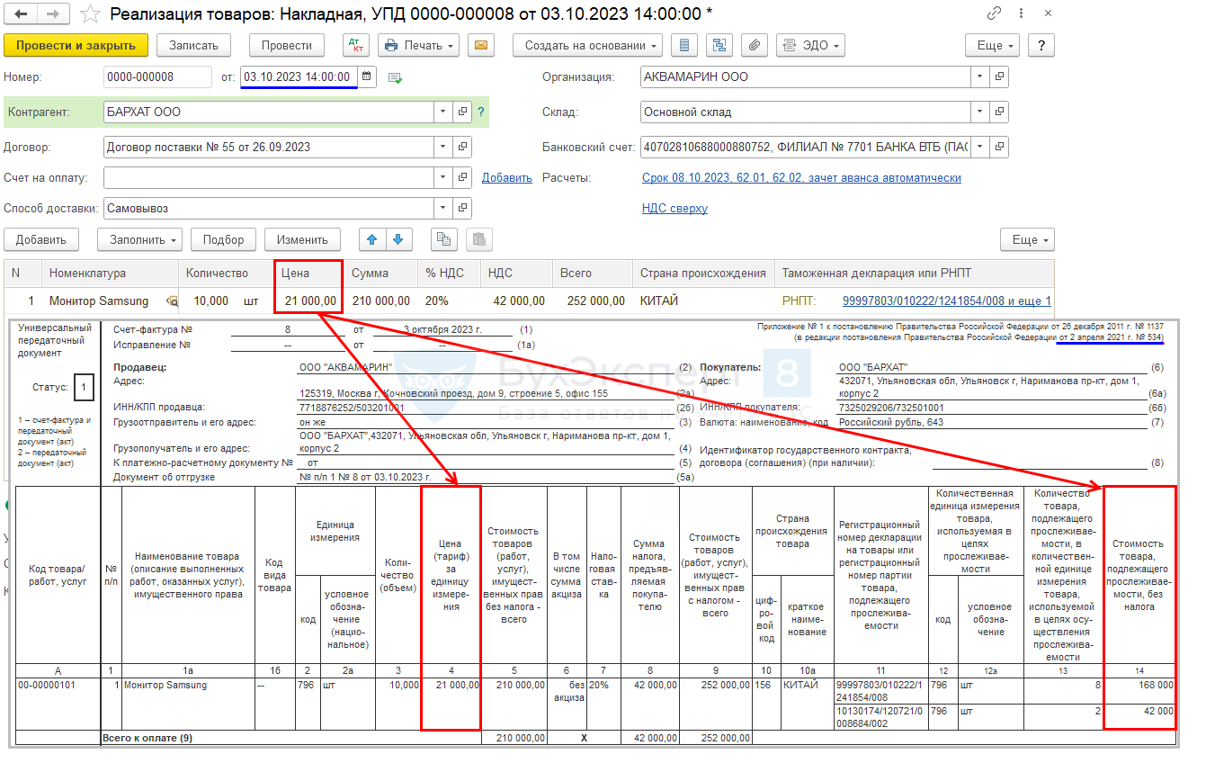 С 01.10.2023 (с релиза 3.0.142.56) в форму УПД и СФ добавлена гр. 14 «Стоимость товара, подлежащего прослеживаемости, без налога». В ней указывается стоимость товаров без учета НДС по каждой строке.