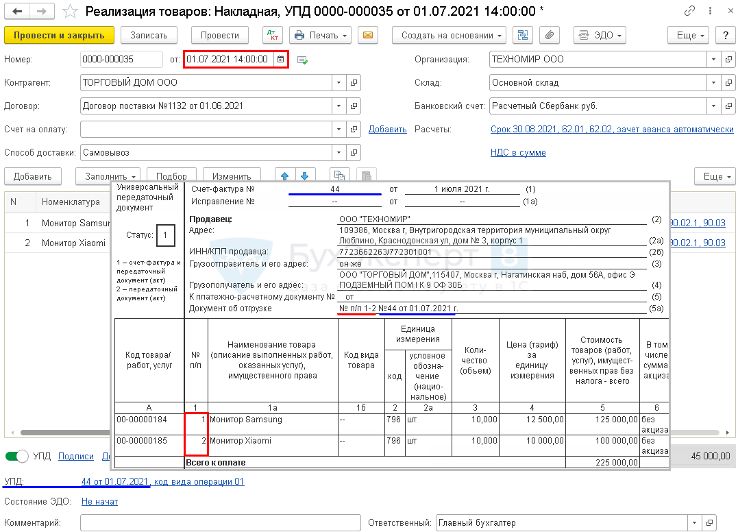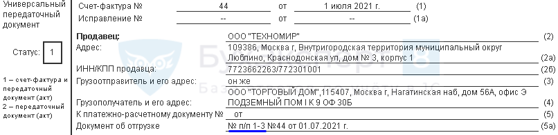 - № … от — номер и дата документа отгрузки по этим позициям — в данном случае номер УПД, т. к. он выполняет роль документа отгрузки.