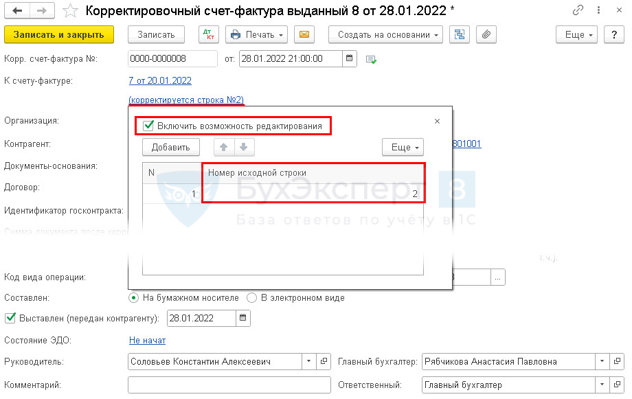 При необходимости можно откорректировать вручную Номер исходной строки в документе Корректировочный счет-фактура выданный с помощью флажка Включить возможность редактирования.