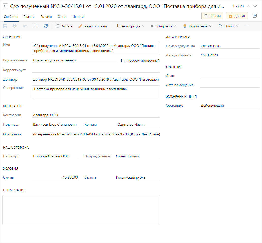 Счета-фактуры, полученные от контрагентов через сервисы обмена, заносятся в Directum RX автоматически. Ответственному за абонентский ящик придет задание на дальнейшую обработку документа в системе. Сотруднику останется проверить полноту и корректность заполненных полей в карточке документа.