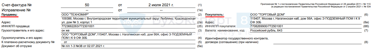 Для более компактного расположения реквизитов фирмой 1С было принято решение разместить реквизиты Продавца и Покупателя в СФ и УПД в 2 колонки. По мнению разработчиков 1С, все данные сохранены, поэтому такое расположение не противоречит Постановлению. Методисты ФНС не имеют возражений против такого подхода