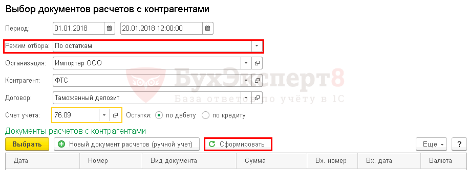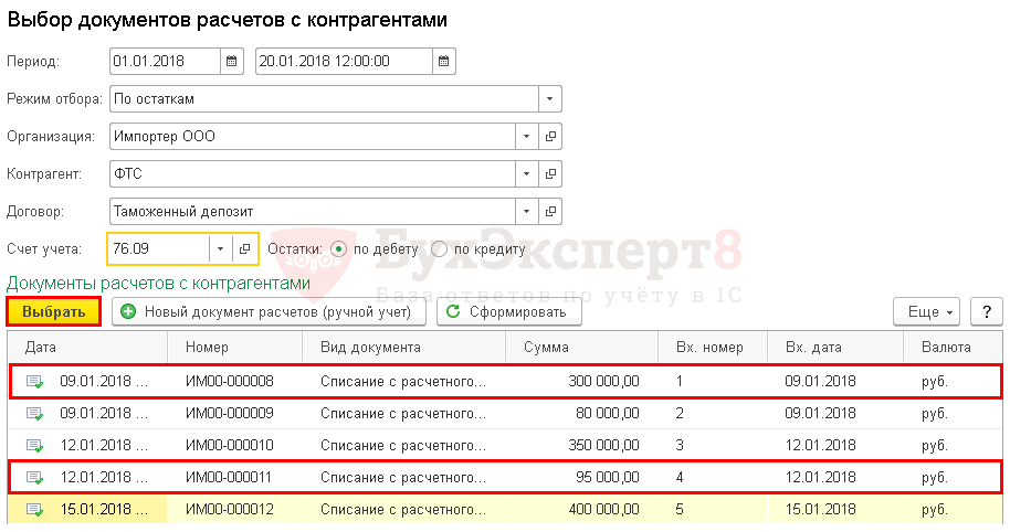 - по кнопке Добавить в поле Документ аванса перейти в форму Выбора документов расчетов с контрагентами .