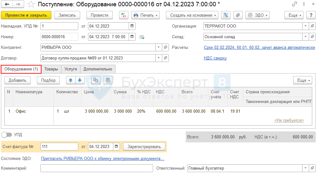 оприходование и ввод в эксплуатацию ОС — документ Поступление (акт, накладная, УПД) вид операции Основные средства.