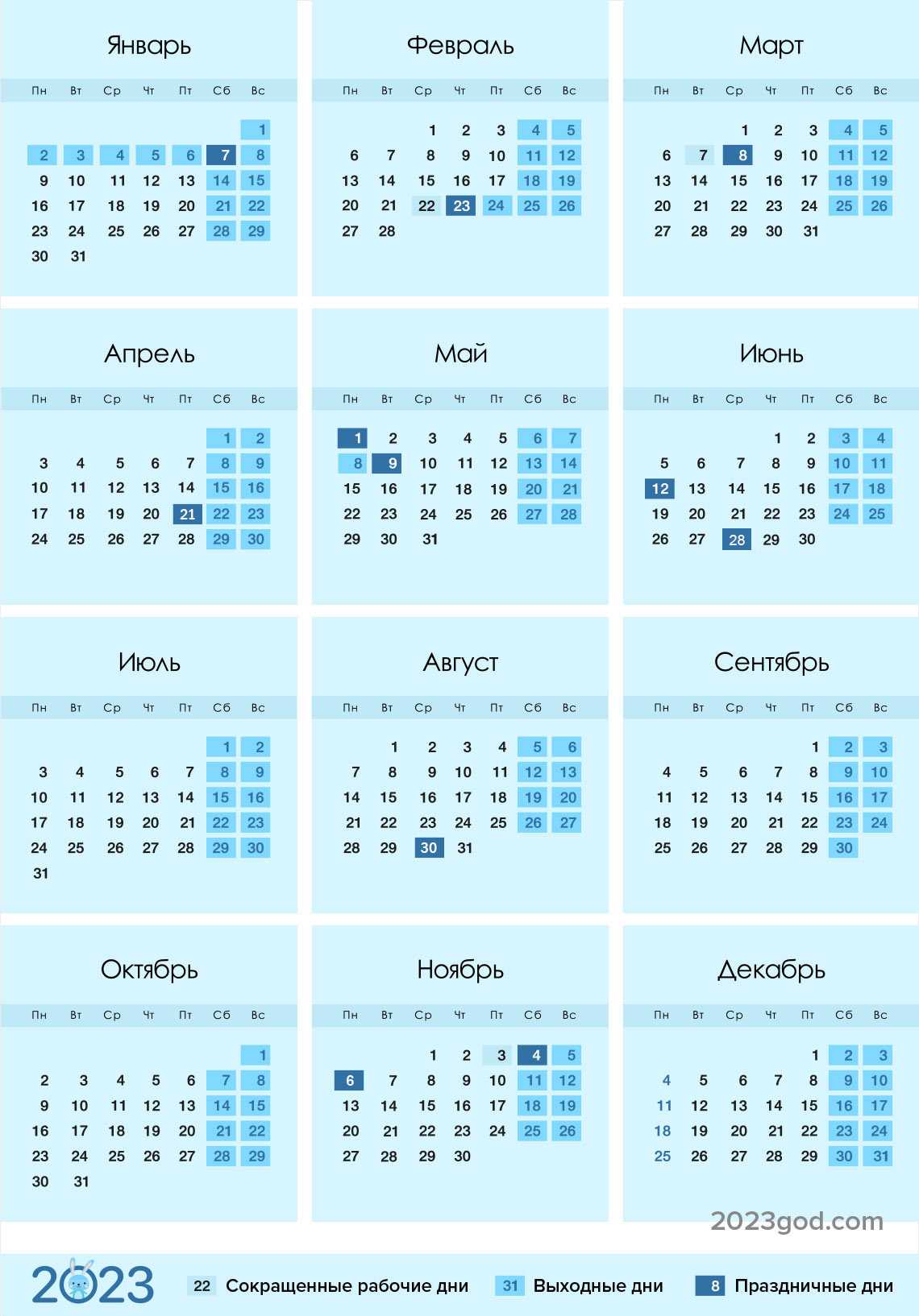 2023 год не високосный, начинается и заканчивается в воскресенье, состоит из 365 дней, из них рабочих – 249, выходных – 116 (сюда включаются и 8 общенациональных праздников).