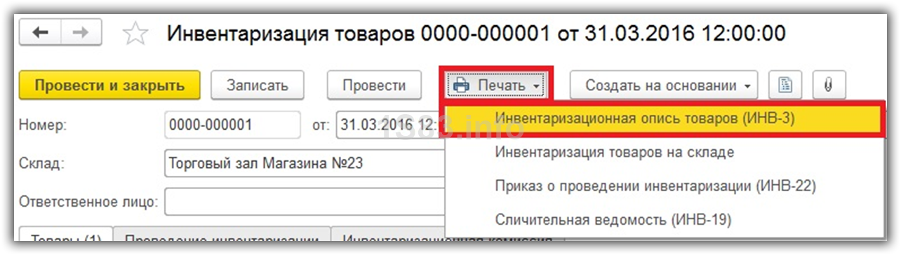 Организация должна утвердить формы первичных документов, в т. ч. инвентаризационную опись ТМЦ и сличительную ведомость. В 1С используется Инвентаризационная опись товаров (ИНВ-3) и Сличительная ведомость (ИНВ -19).
