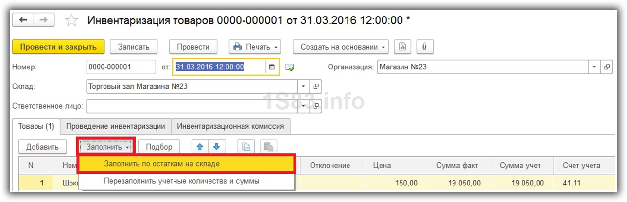 Поле Склад заполняется из справочника Склады. Поле Ответственное лицо будет заполнено автоматически при условии, что в карточке склада было указано Ответственное лицо.