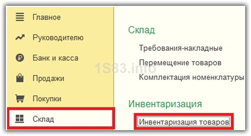 Начнём с проведения самой инвентаризации. Для этого следует воспользоваться одноименным документом в разделе программы «Склад».
