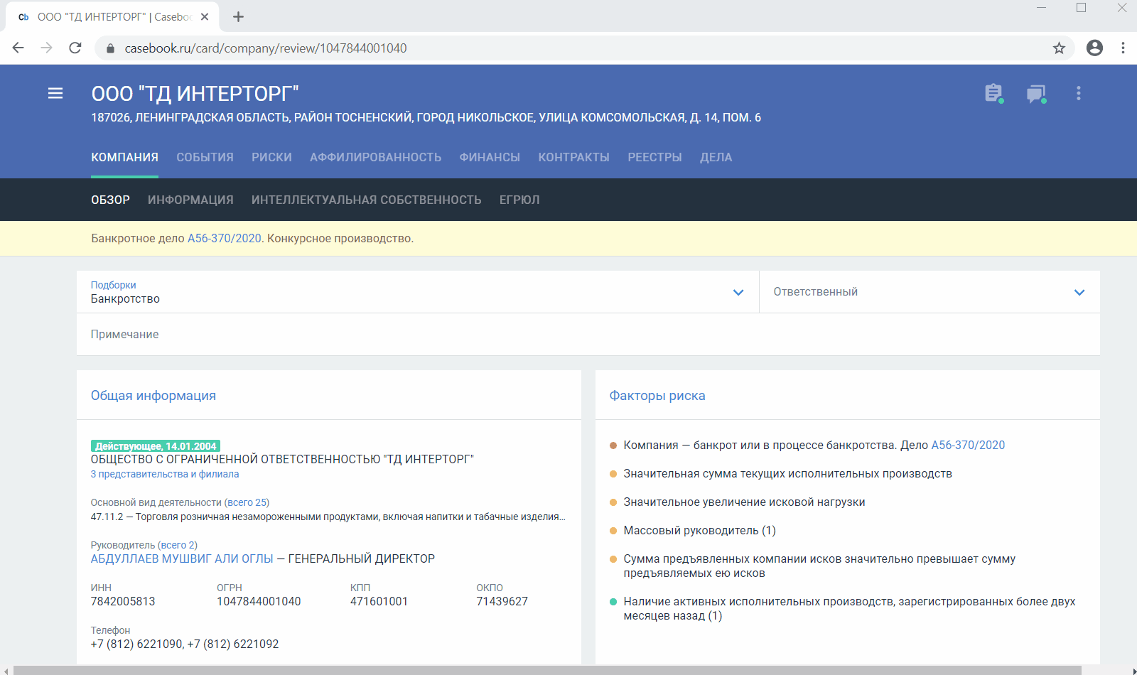 Информация о подобных сообщениях будет размещена на вкладке «Сводка» в карточке компании в блоке «Намерения подать иск о банкротстве».