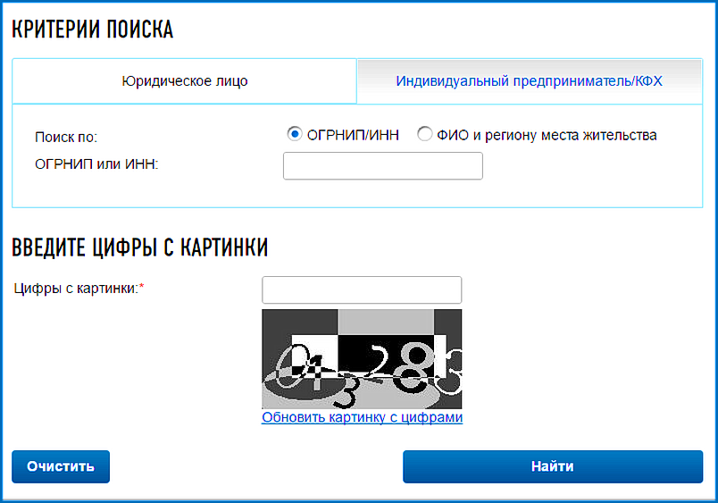 - В поле «Поиск по» выберите вариант с известными вам данными — ОГРН и ИНН или ФИО и регион проживания.