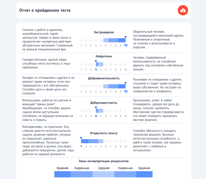 - Тест личности IPP-NEO или пятифакторный тест “Большая пятерка” оценивает личность кандидата с использованием пяти общих категорий личности и тридцати подкатегорий.