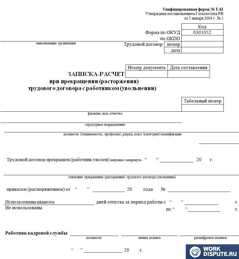 Заполнение аналогичного бланка справки-расчета происходит по строго регламентированной форме типа Т-61. Каждому работодателю при увольнении сотрудника, прежде чем приступить к заполнению представленной формы, необходимо скрупулёзно изучить следующие вопросы: