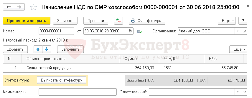 - Сумма — сумма фактически выполненных СМР хозспособом (налогооблагаемая база).