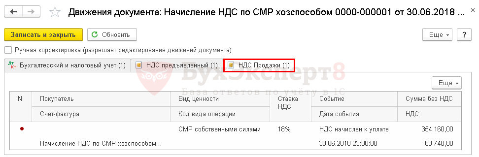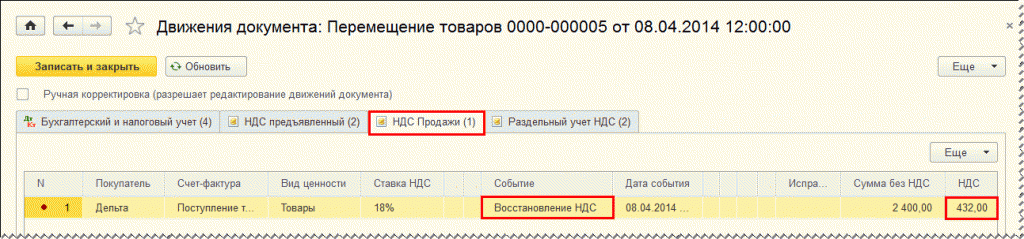 В регистр НДС Продажи вводится запись с событием Восстановление НДС (рис.6).