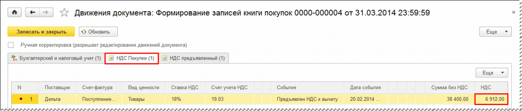В регистр накопления НДС предъявленный на суммы НДС, принятые к вычету, вводятся записи с видом движения Расход и событием Предъявлен НДС к вычету, а в регистр накопления НДС Покупки вводится запись для Книги покупок, отражающая принятие НДС к вычету (рис. 5).