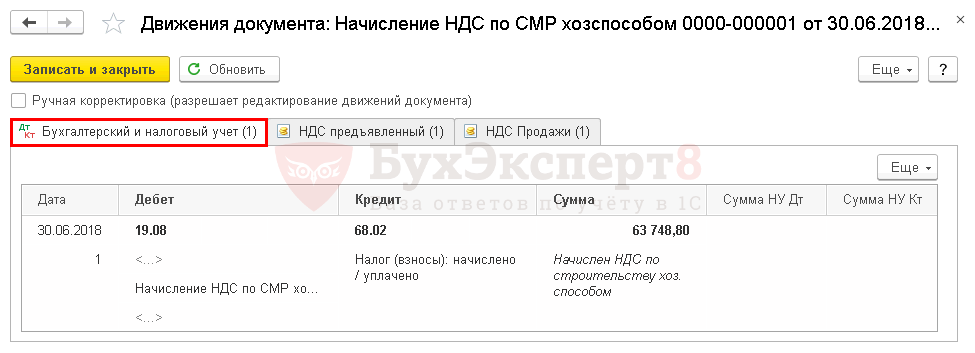 регистрационную запись по Виду ценности СМР собственными силами на сумму начисленного НДС.