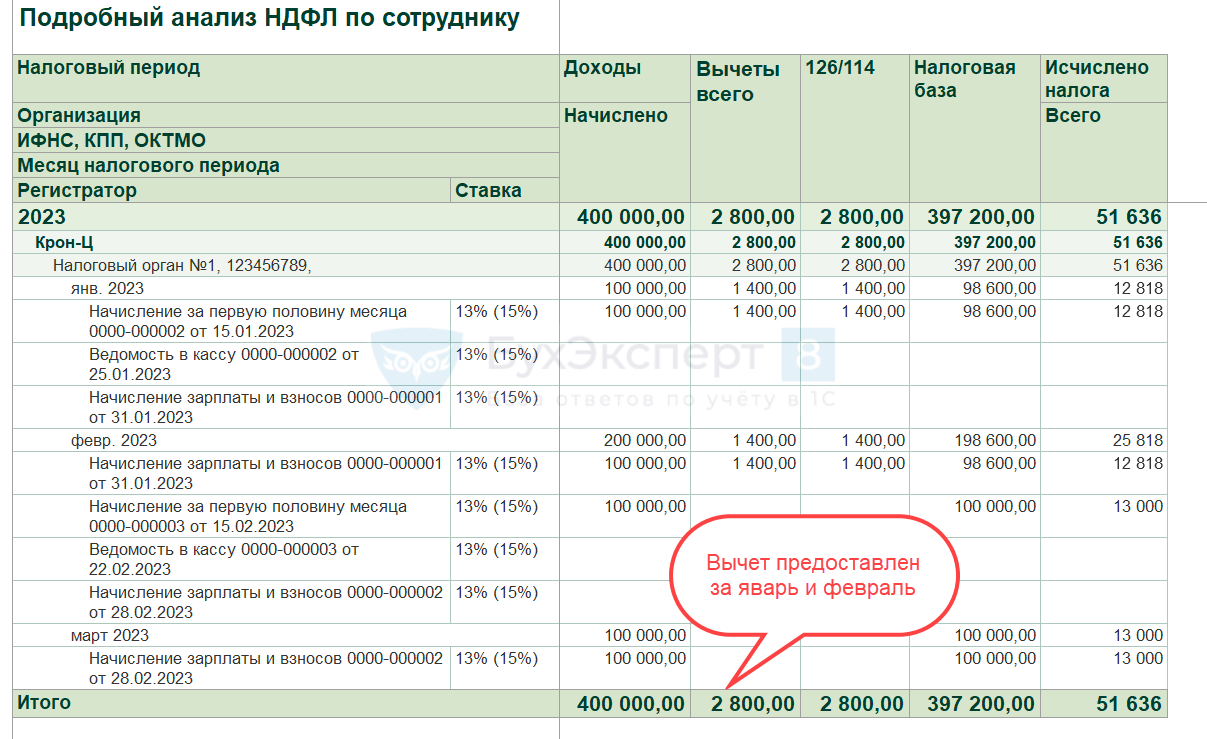 Проверим суммы дохода и налога в учете по НДФЛ отчетом Подробный анализ НДФЛ по сотруднику (Налоги и взносы – Отчеты по налогам и взносам). Доход в налоговом учете за январь и февраль суммарно составил 300 тыс. руб. До превышения лимита была одна выплата в январе и две выплаты в феврале. Вычет предоставлен за два месяца в размере 1 400 руб. х 2 мес. = 2 800 руб. Ошибки нет.