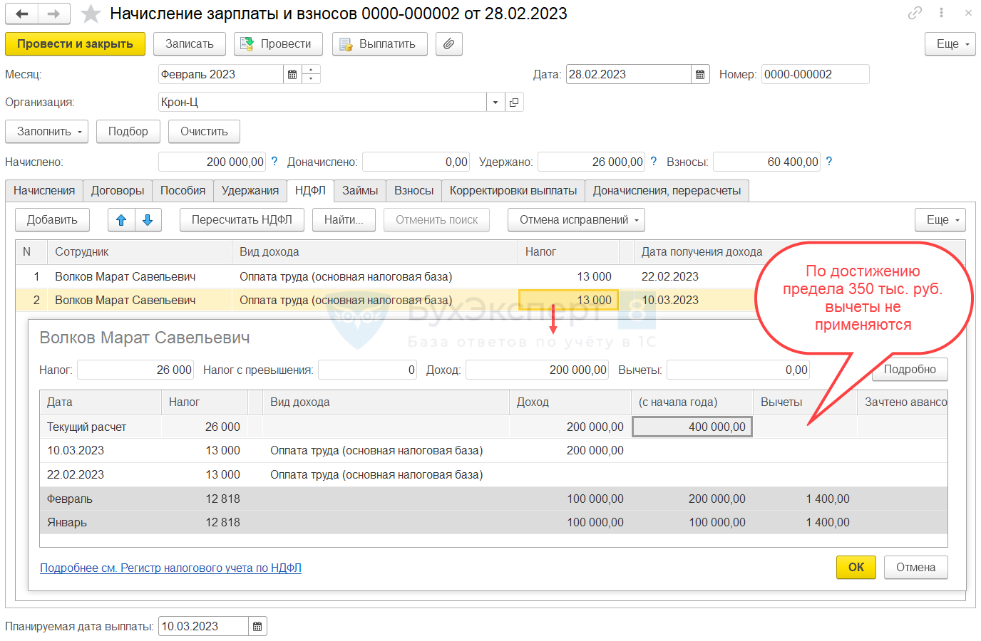 Выплатим аванс и по окончании месяца рассчитаем зарплату за февраль. Суммарно начисленная зарплата за январь и февраль превышает предел в 350 тыс. руб. Поскольку выплата остатка зарплаты за февраль произойдет уже в марте, в налоговом учете по НДФЛ доход работника превысит лимит в марте, а не в феврале. Поэтому право на вычет у сотрудника за февраль сохраняется.