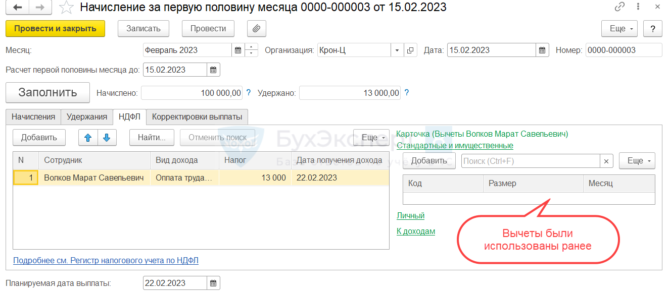 После выплаты зарплаты за январь рассчитаем аванс за февраль. На планируемую дату выплаты аванса вычеты за январь и февраль уже потрачены, в документе начисления они не предоставляются.