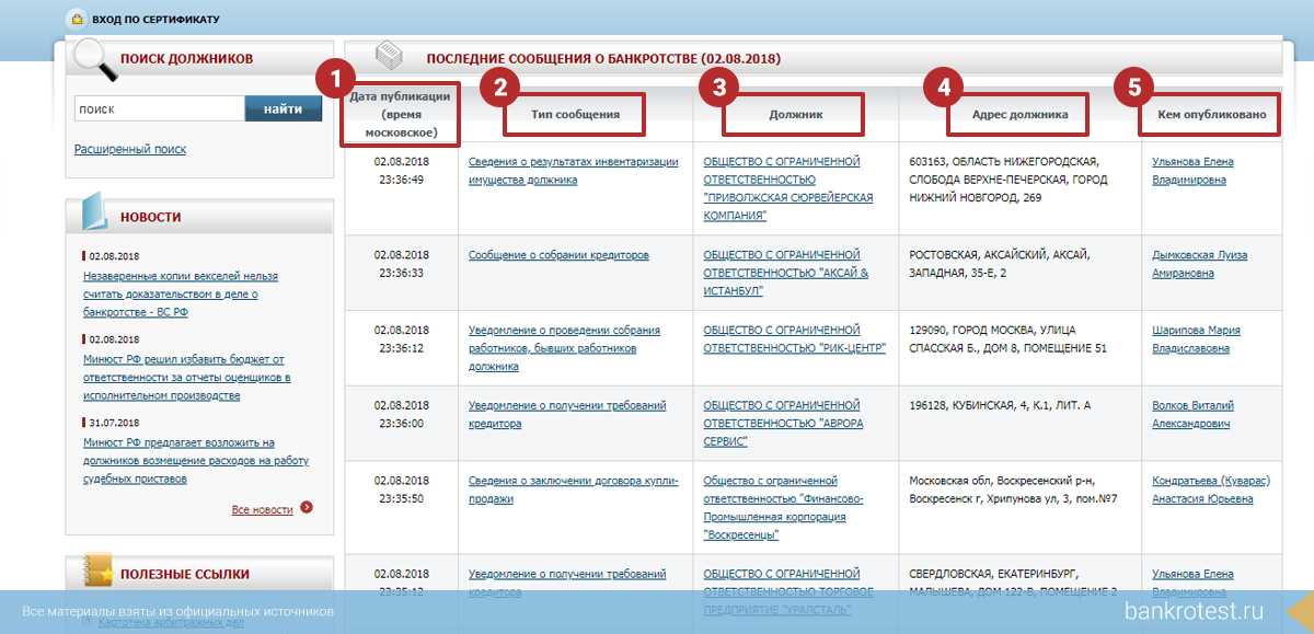 Единый федеральный реестр банкротов находится по адресу https://bankrot.fedresurs.ru/. На главной странице в хронологическом порядке высвечиваются последние сообщения о применении той или иной процедуры банкротства. Сведения представлены в табличной форме: