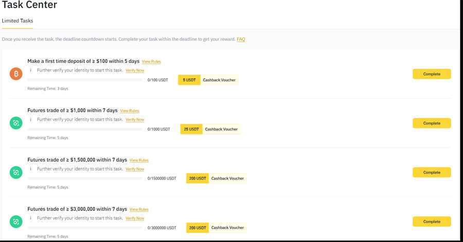 To get Free 200 + 200 USDT cashback voucher, You have to complete very high amount transactions but just by depositing $50 within 6 days after sign up account. You can get free 500 USDT. Again trade using deposited $50 and unlock another $500 USDT. Unlock all tasks and earn upto 1460 USDT bonus.
