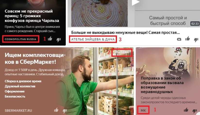 1 — нативная реклама инфоресурсов: при клике пользователь попадает не на блог в Дзен, а на сайты, где размещены статьи.2 — прямая реклама: недвусмысленно указан характер материала — «Реклама», присутствует название бренда, читается посыл. 3 — личный блог, где пользователь — не бренд — предлагает собственный контент. С ростом популярности авторы Дзен начинают зарабатывать, в том числе и на размещении в своем блоге нативной рекламы от брендов.