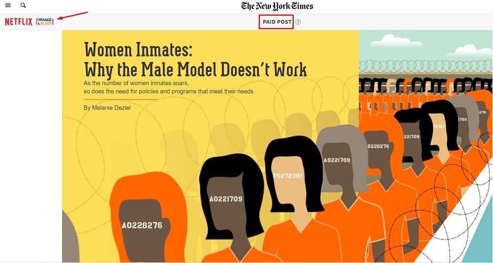 Пример нативной статьи от New Times и Netflix — медиа анонсировало новый сезон сериала «Оранжевый — хит сезона». Яркие образы и много небольших деталей, которые хочется рассмотреть