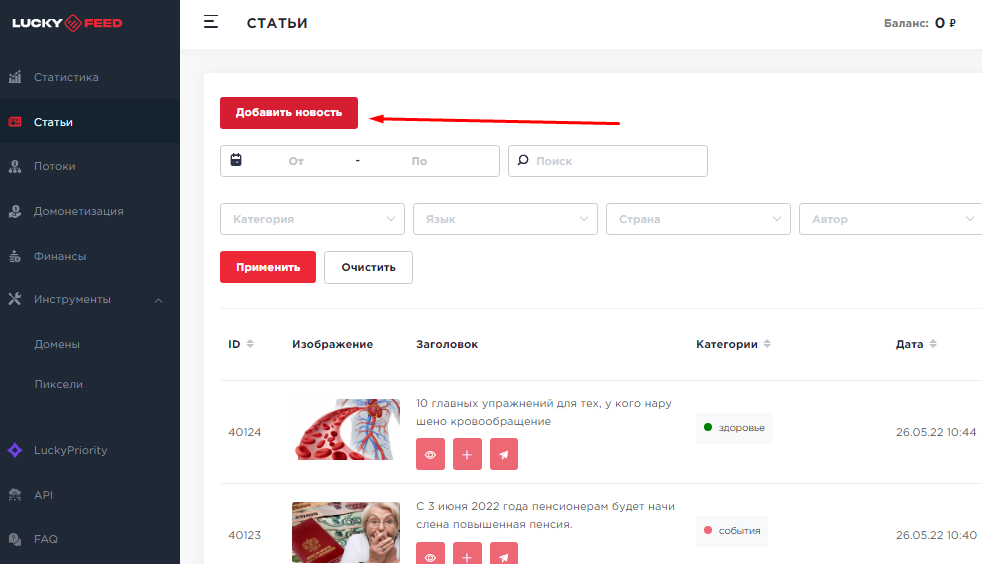 Также во вкладке “Статьи” можно добавить и свою новость, которая по вашему мнению привлечет большой объем целевого трафика.