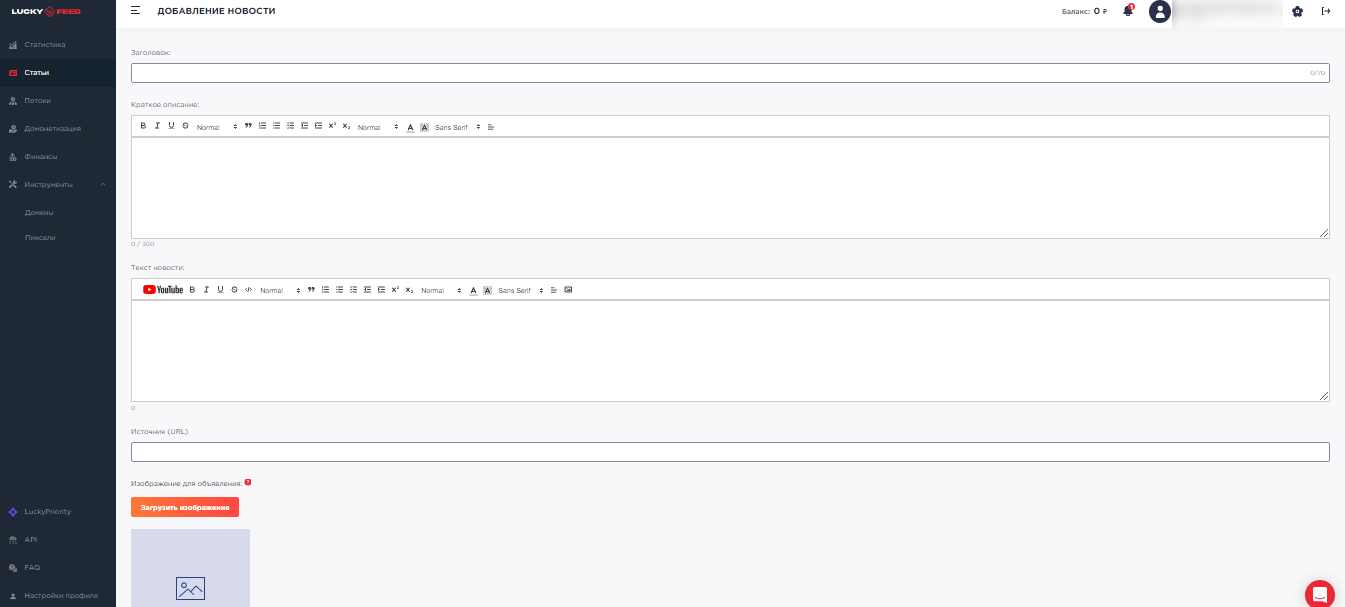 Во встроенном редакторе нужно прописать заголовок новостной публикации, разместить краткое описание и основной текст. При необходимости, текст можно разбавить картинками и видео.