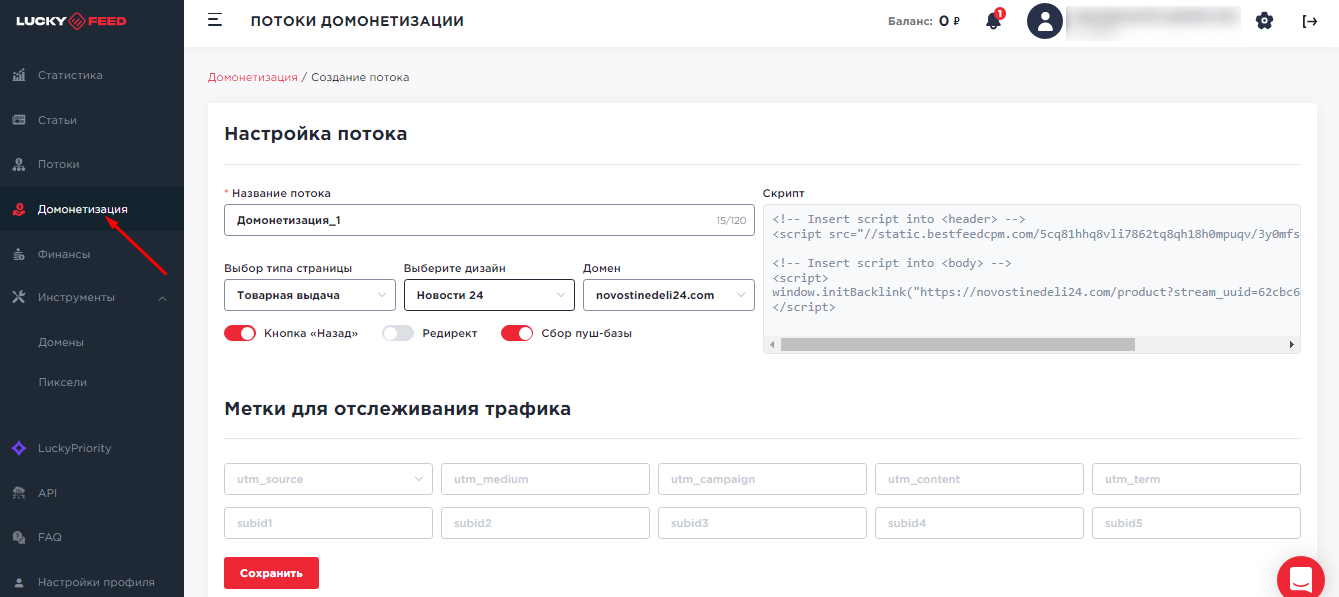 Во вкладке “Домонетизация” создаются дополнительные потоки для сбора push-базы. Для создания нового потока, нужно присвоить ему название, выбрать тип страницы с выдачей, выбрать из списка нужный домен, а также добавить метки для отслеживания трафика.