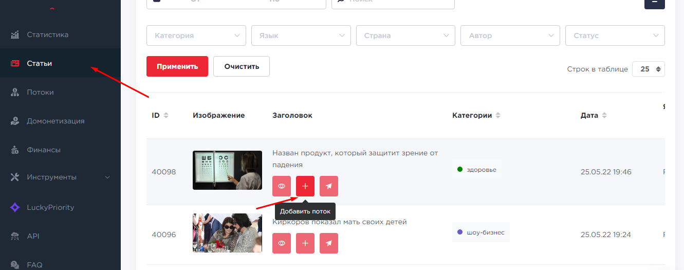 После авторизации, в личном кабинете можно приступать к созданию нового потока. Для этого во вкладке “Статьи” нужно выбрать из списка одну из статей и нажать на значок “+”.